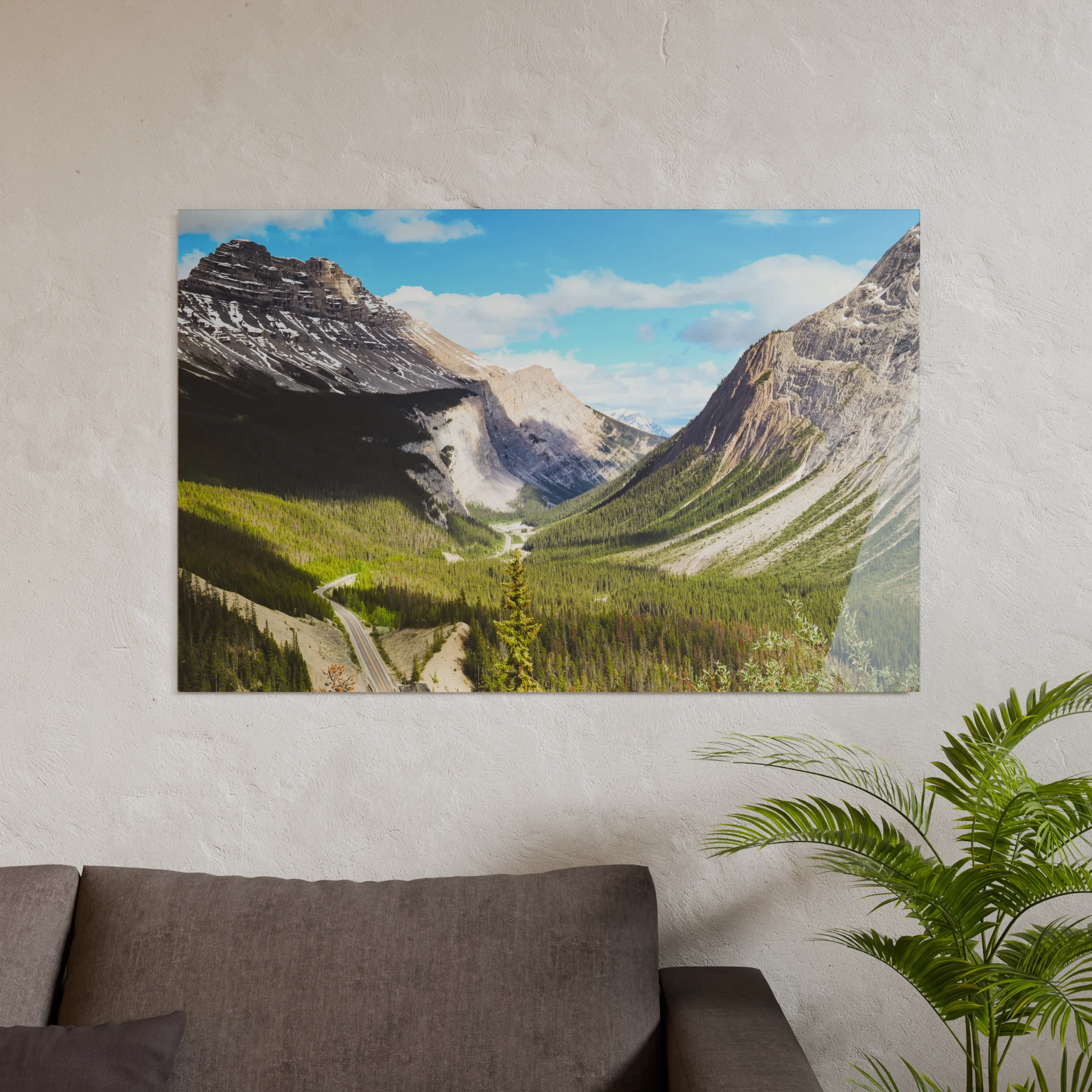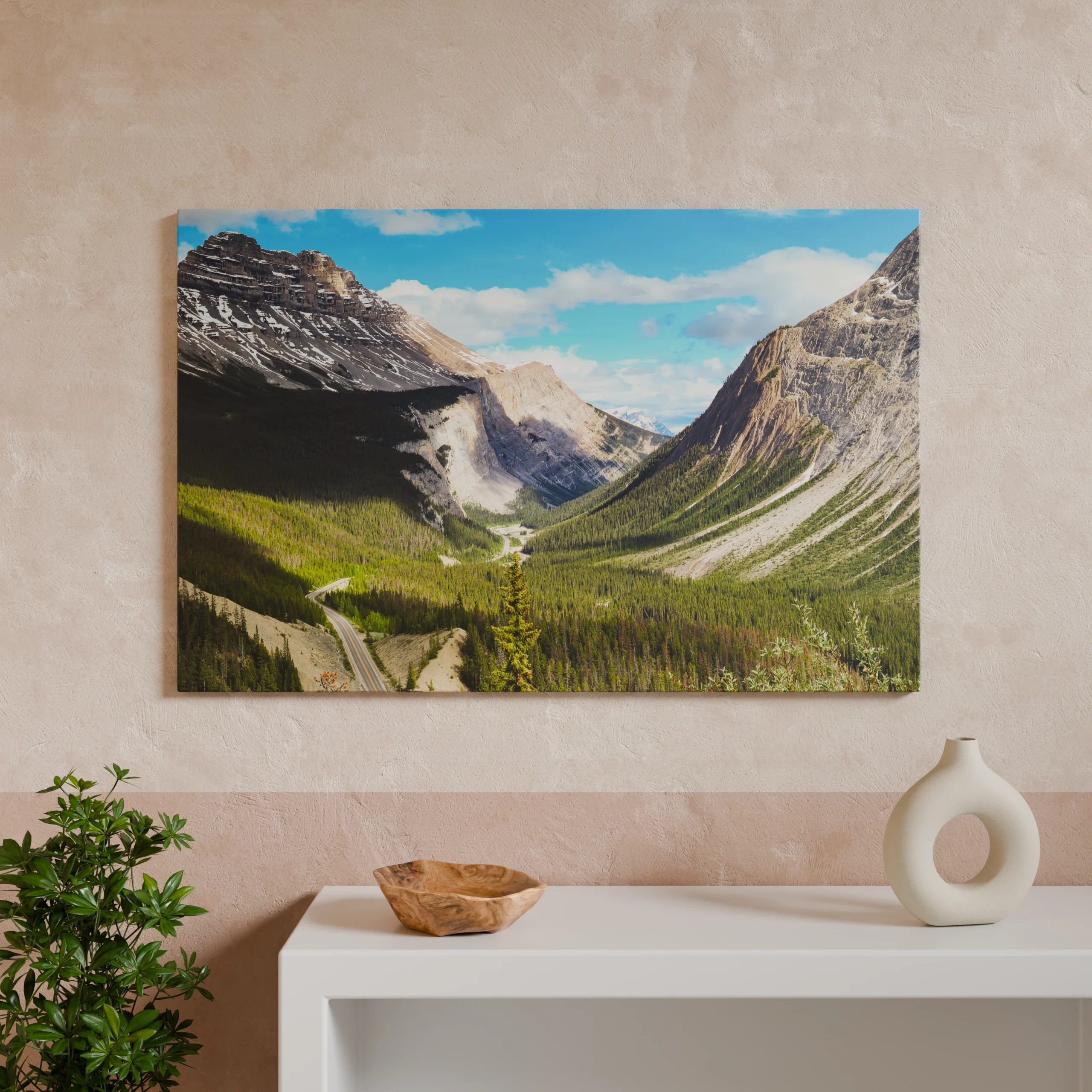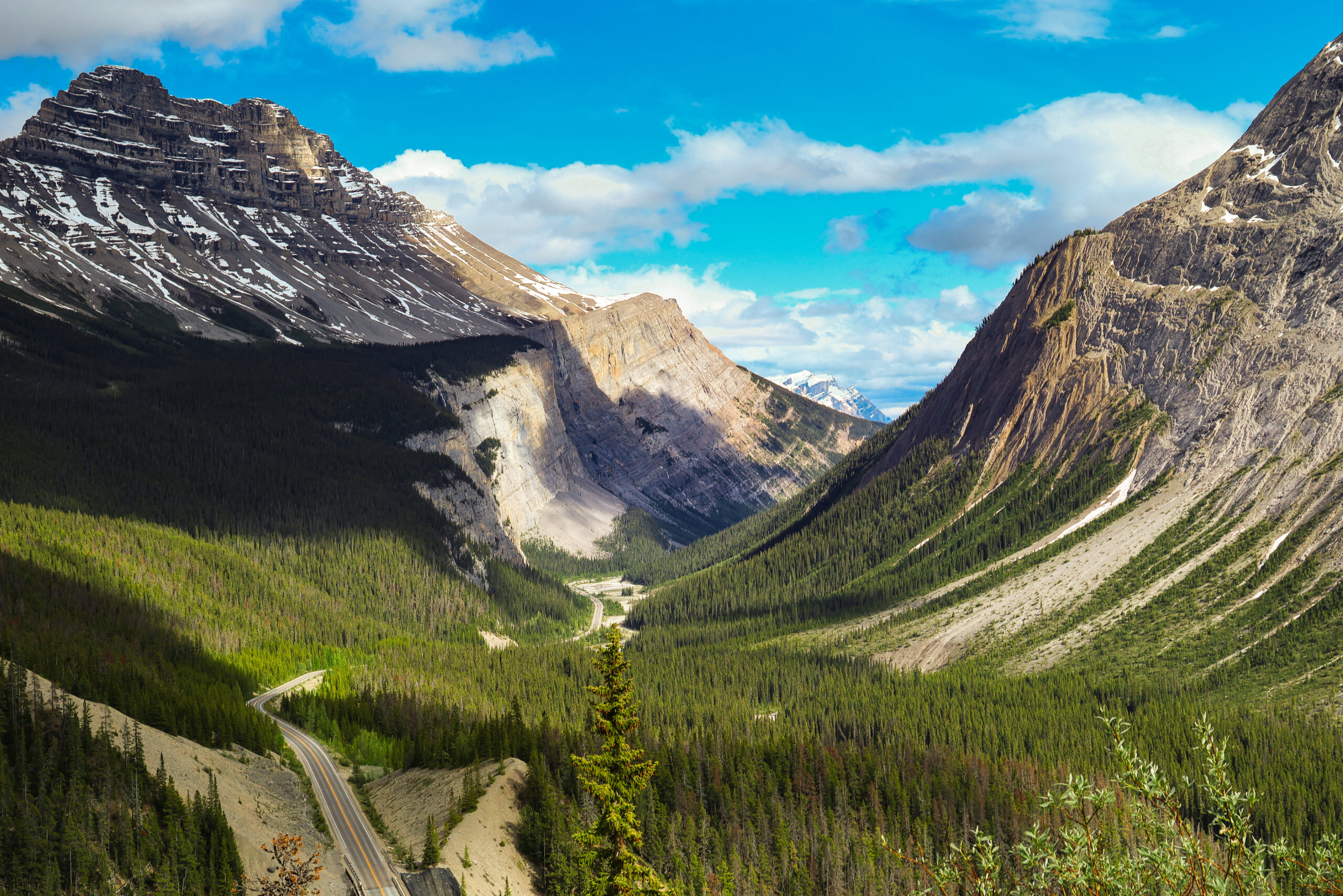 Dieses Bild entstand tagsüber im Glacier-Nationalpark in Kanada. Der Blick öffnet sich in ein weites, von mächtigen Bergflanken eingerahmtes Tal. Schroff geschichtete Felswände ragen links und rechts empor, teils noch von Schneeresten gezeichnet, während sich tief unten eine schmale Straße durch dichte, sattgrüne Nadelwälder windet. Der Himmel leuchtet klar in kräftigem Blau und verleiht der Szene eine eindrucksvolle Weite.