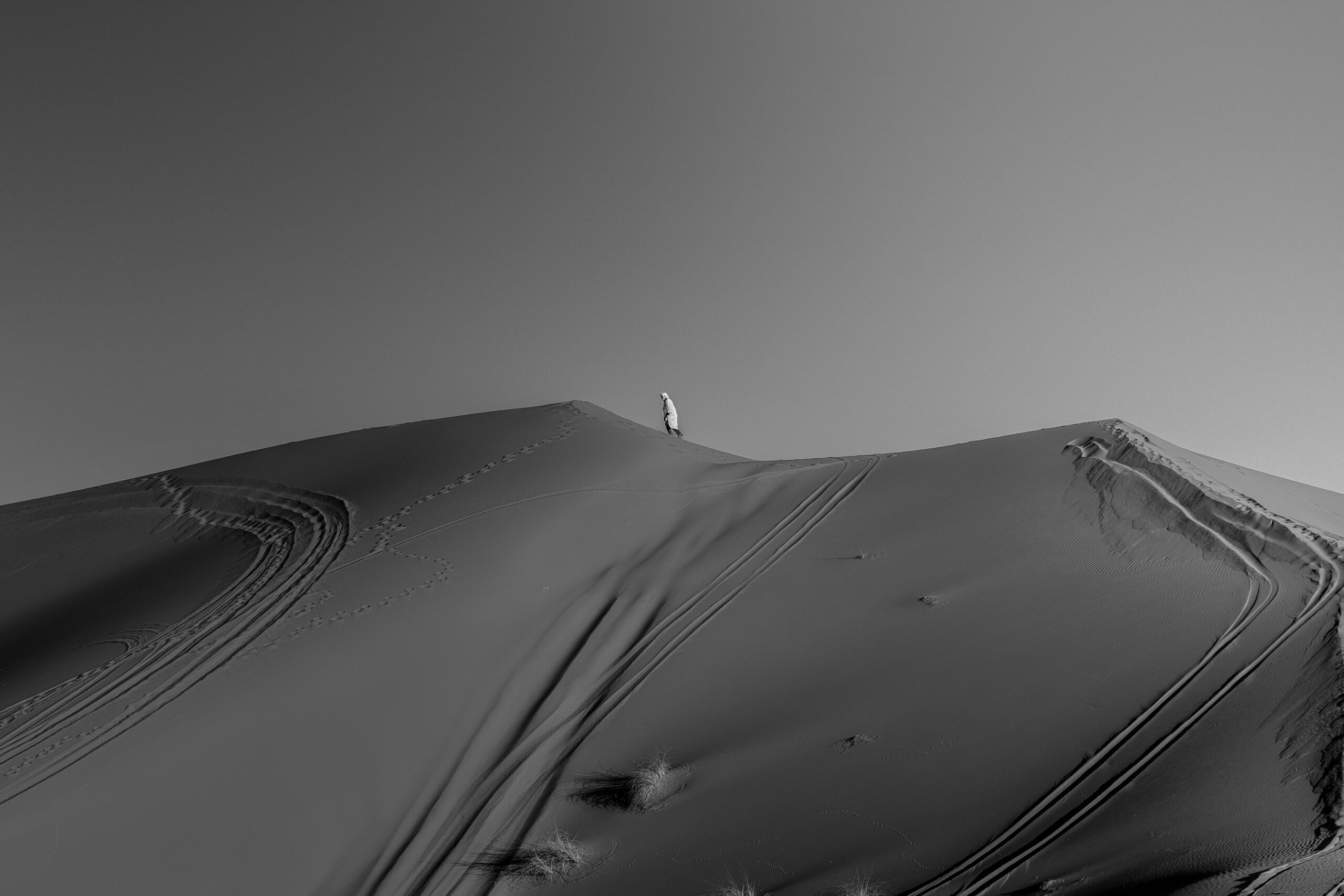 Diese Schwarzweiss-Fotografie zeigt eine einzelne Sanddüne, deren Linien und Strukturen vom Wind gezeichnet wurden – eine Hommage an die stille Kraft der Natur. Entstanden ist das Bild auf einer meiner Touren in die marokkanische Sahara. Als das letzte Licht des Tages  auf die Dünenkämme fiel und die Schatten lang und weich waren. Der reduzierte Kontrast und die feine Körnung verleihen dem Motiv eine fast meditative Ruhe.
