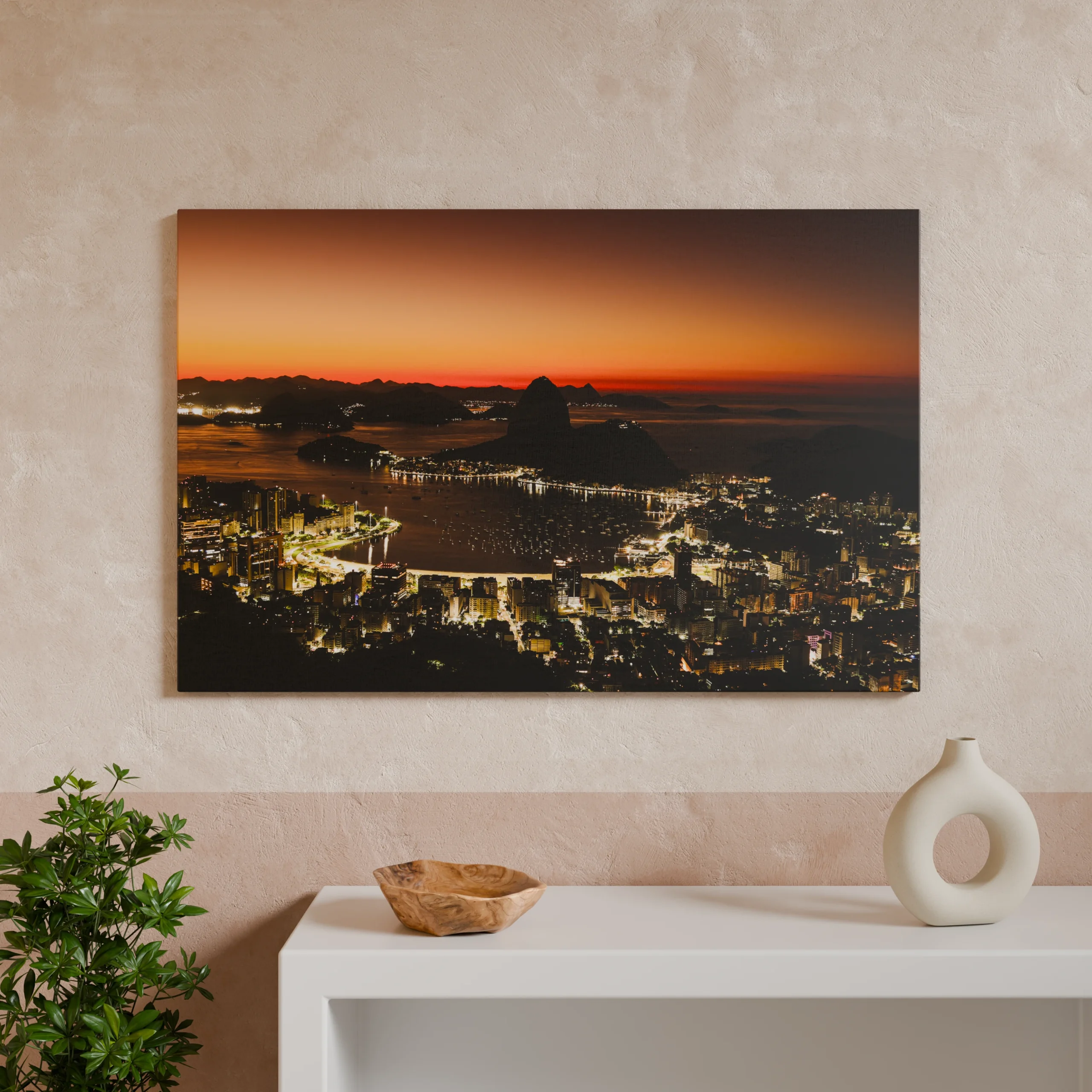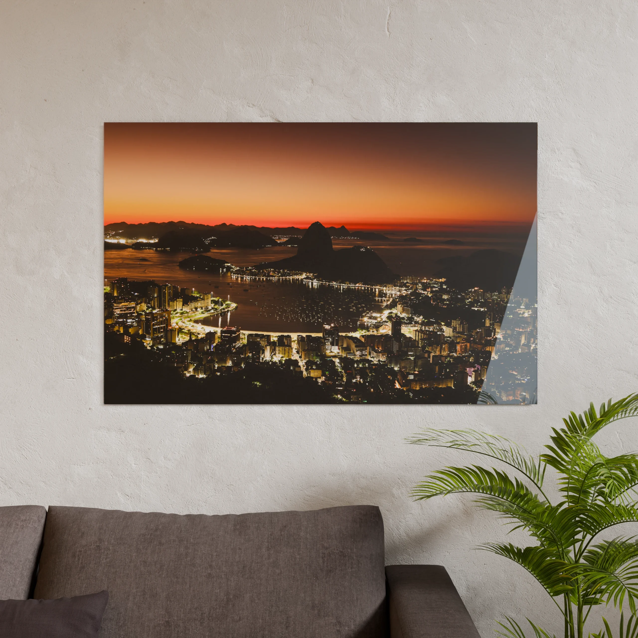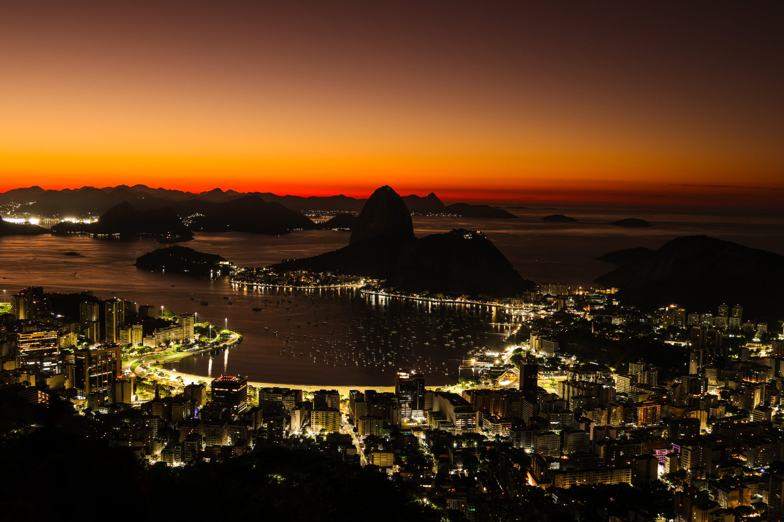 Der Zuckerhut zeichnet sich klar als dunkle Form gegen den Horizont ab. Darunter liegt die Bucht ruhig, fast unbewegt. Straßen, Häuser und Küstenlinien beginnen langsam an Kontur zu gewinnen, ohne ihre nächtliche Zurückhaltung schon ganz aufzugeben.