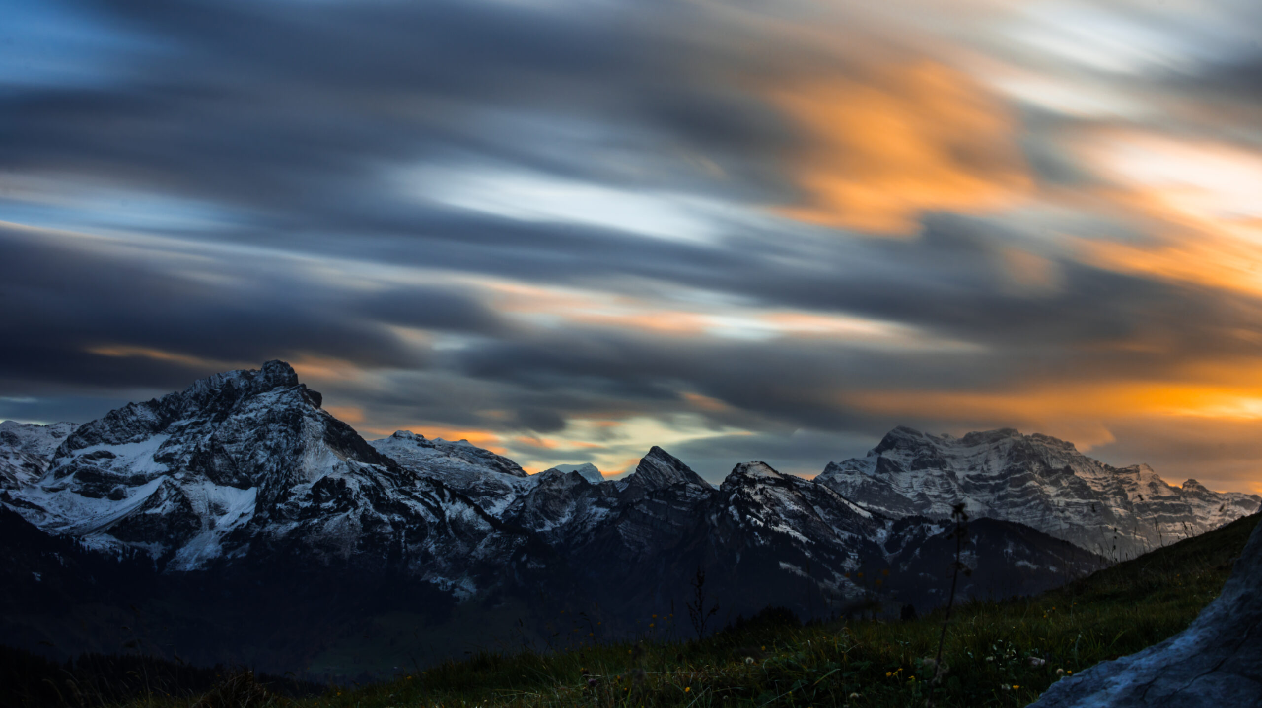Dieses Bild entstand in der Abenddämmerung oberhalb von Amden in der Schweiz. Der Blick richtet sich auf den markanten Mürtschenstock, während sich rechts im Hintergrund das Vrenelisgärtli und die Gipfel der Glarner Alpen abzeichnen.