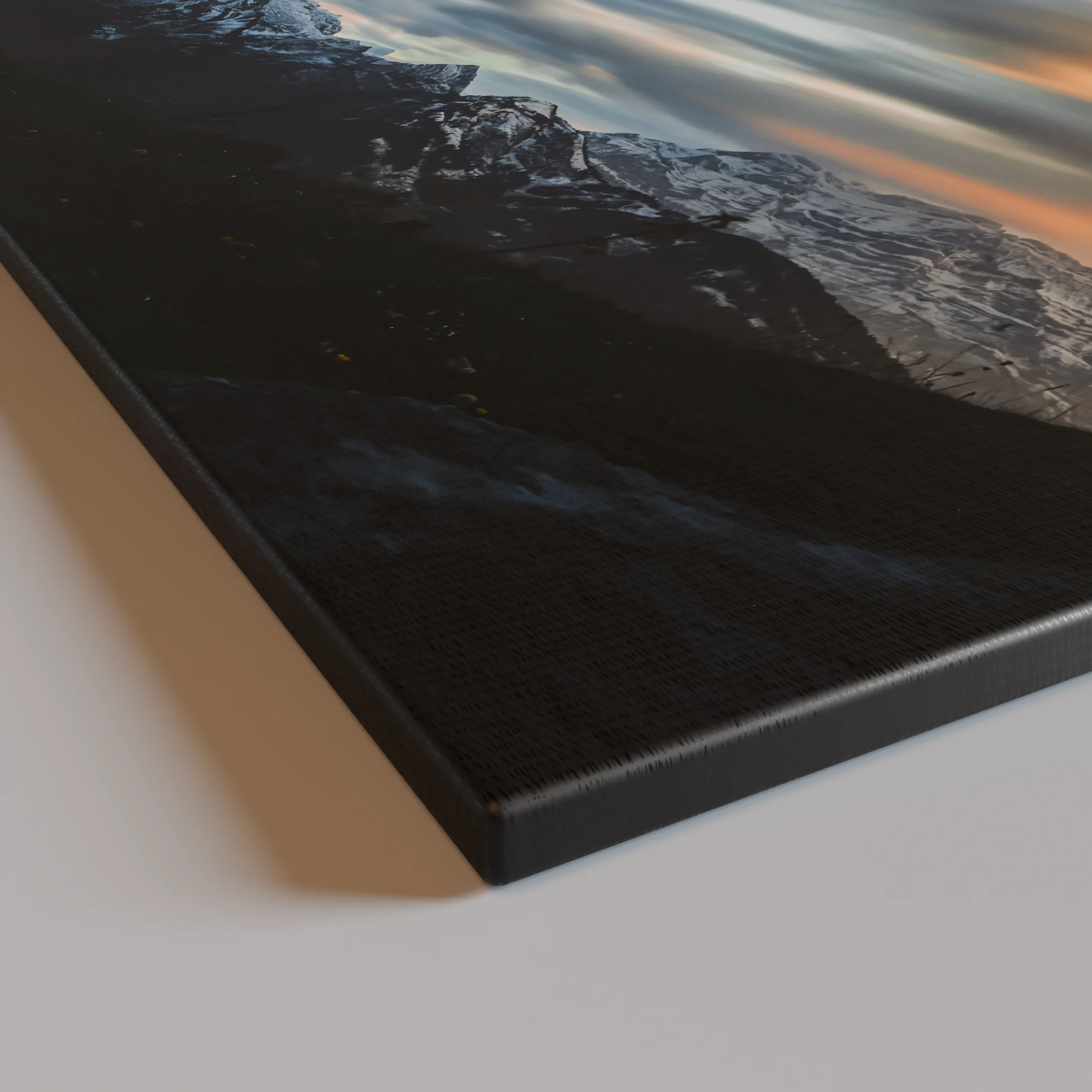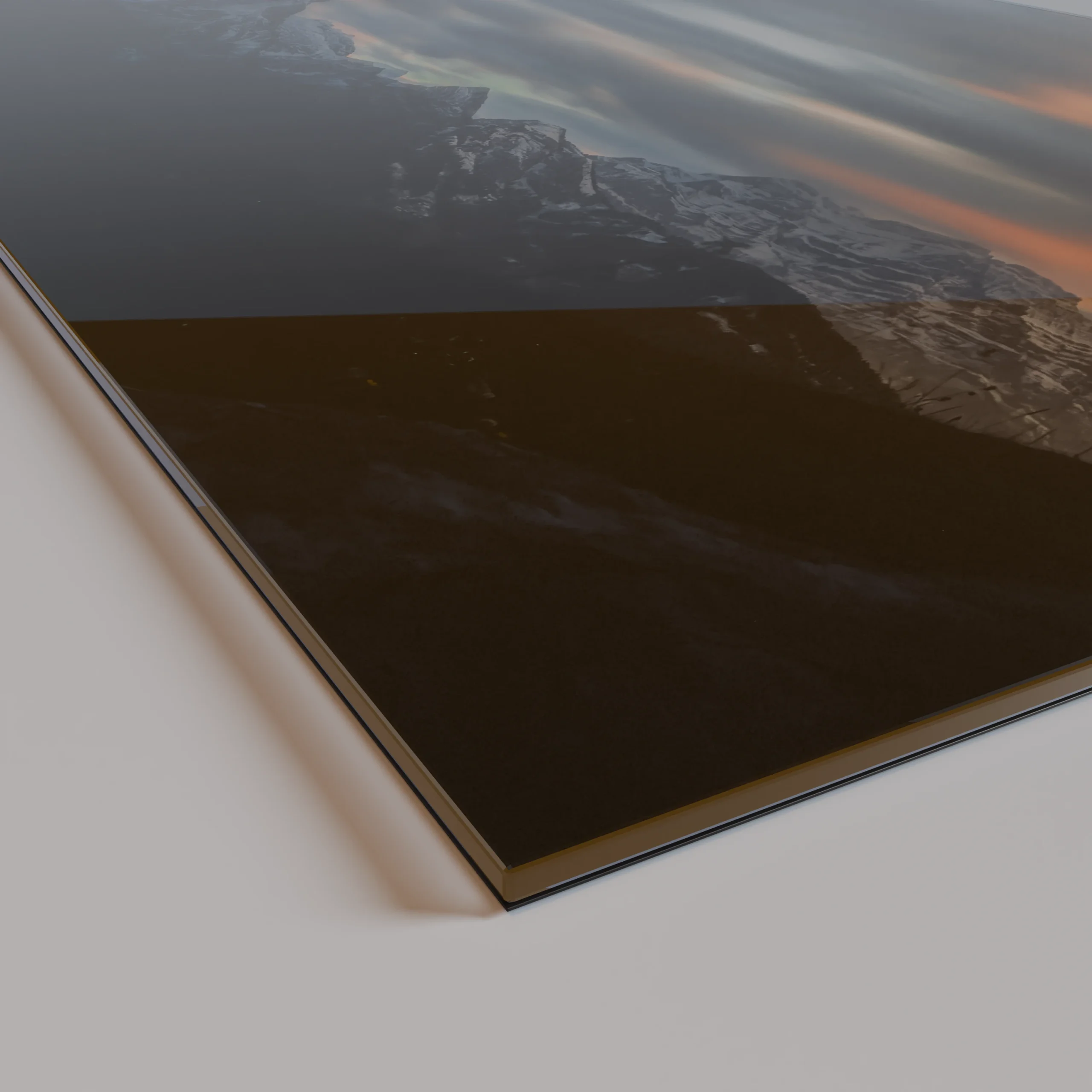 Lange Wolkenzüge gleiten über den Himmel, vom letzten Licht des Tages in warme Goldtöne und kühle Blauschattierungen getaucht. Die Berge liegen bereits im Schatten und verleihen der Szene Tiefe und Ruhe. Ein Augenblick des Übergangs – wenn der Tag sich zurückzieht und die Landschaft still wird.