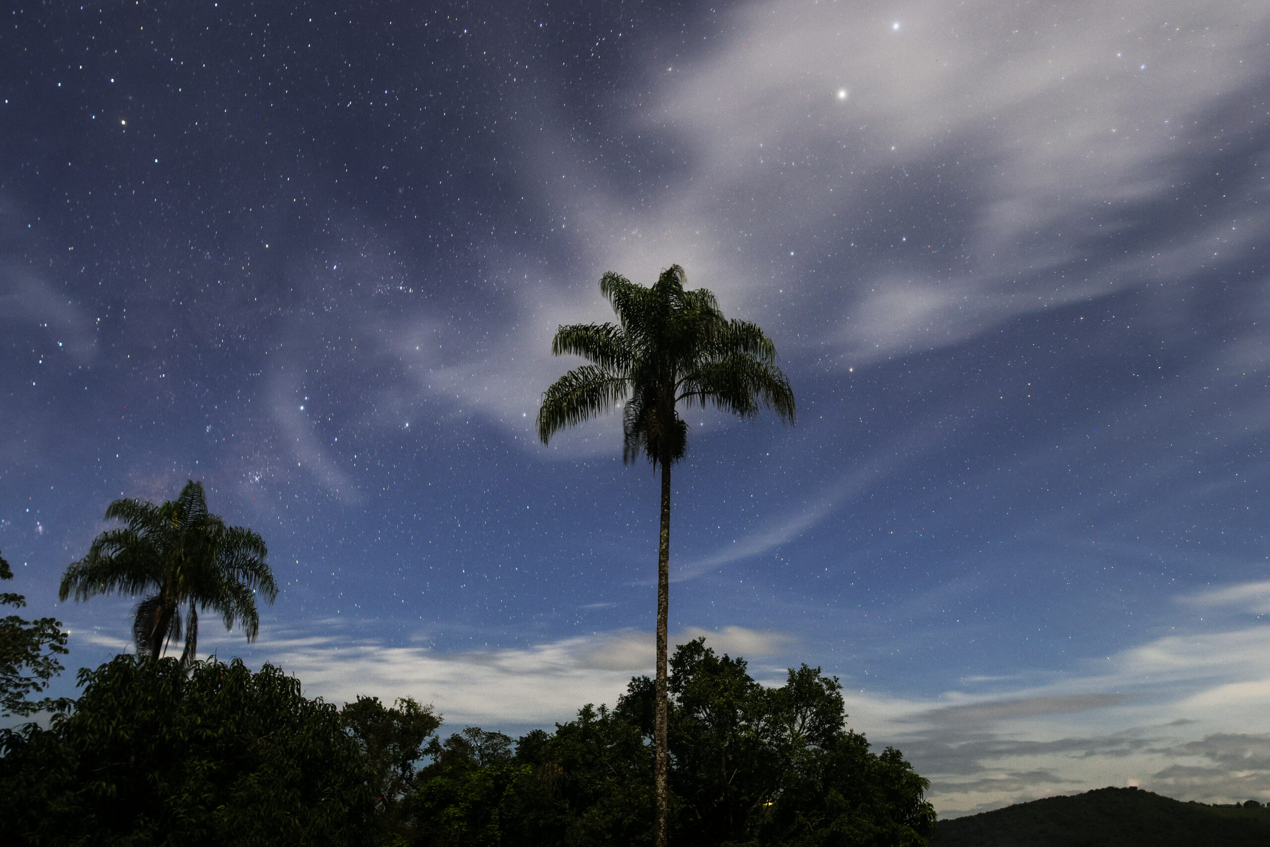 Dieses Bild entstand kurz vor Mitternacht im Nationalpark Serra da Canastra in Brasilien. Unter einem weit geöffneten Sternenhimmel ragen einzelne Palmen als dunkle Silhouetten aus der Landschaft. Feine Wolken ziehen langsam über den Himmel und lassen Sterne immer wieder aufleuchten und verschwinden. Das schwache Licht der Nacht legt sich sanft über Bäume, Hügel und Horizonte – ruhig, fast meditativ.