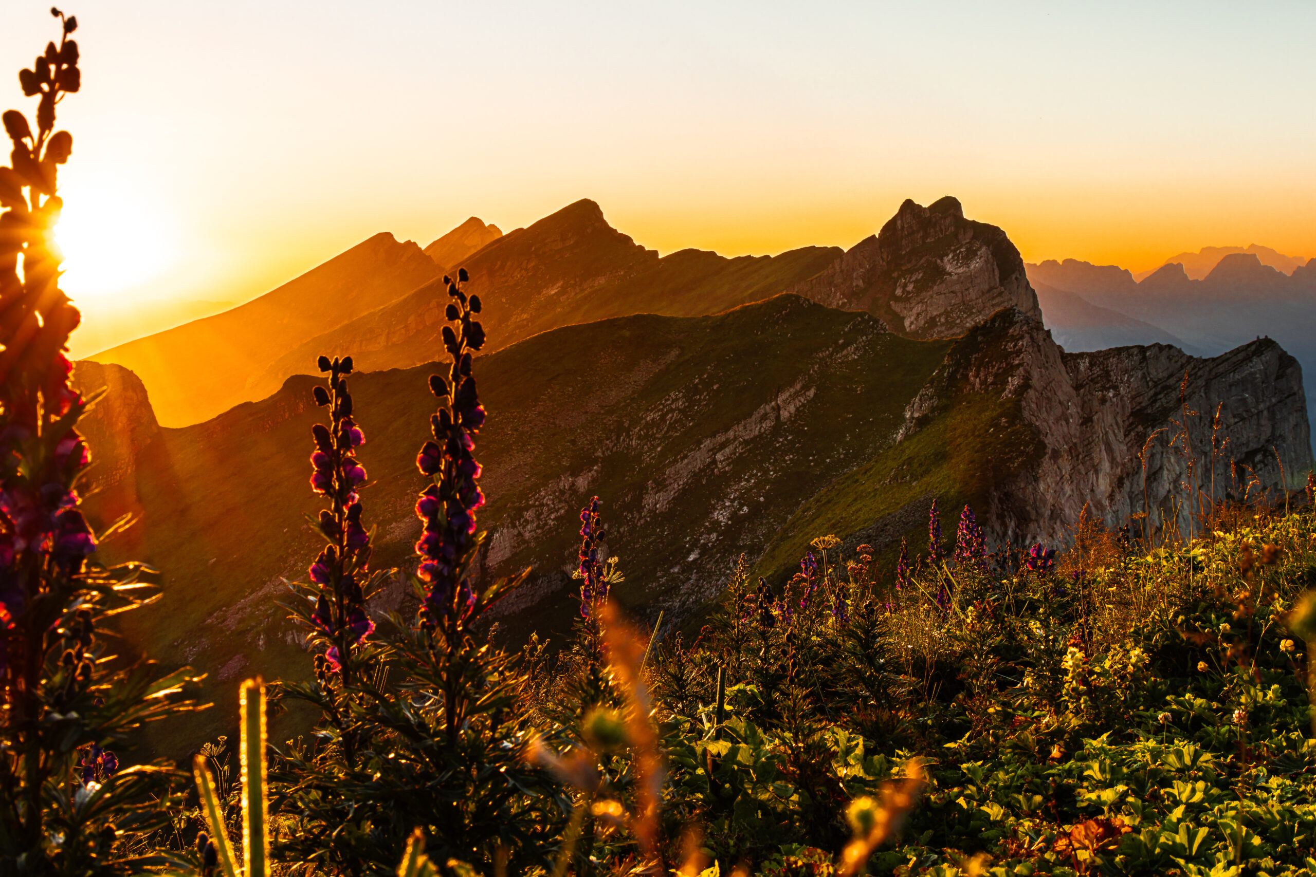 Dieses Bild entstand frühmorgens um 6:30 Uhr auf dem Leistchamm in der Schweiz, nach einer Wanderung mit Übernachtung auf dem Berg – ohne Zelt, nur mit der Stille der Höhe. Der Blick öffnet sich hinüber zu den Churfirsten, deren markante Silhouetten im ersten Licht des Tages aus dem Dunst auftauchen. Warmes Morgenlicht flutet die Bergrücken, während der Vordergrund von alpiner Vegetation und blühenden Pflanzen durchzogen ist.